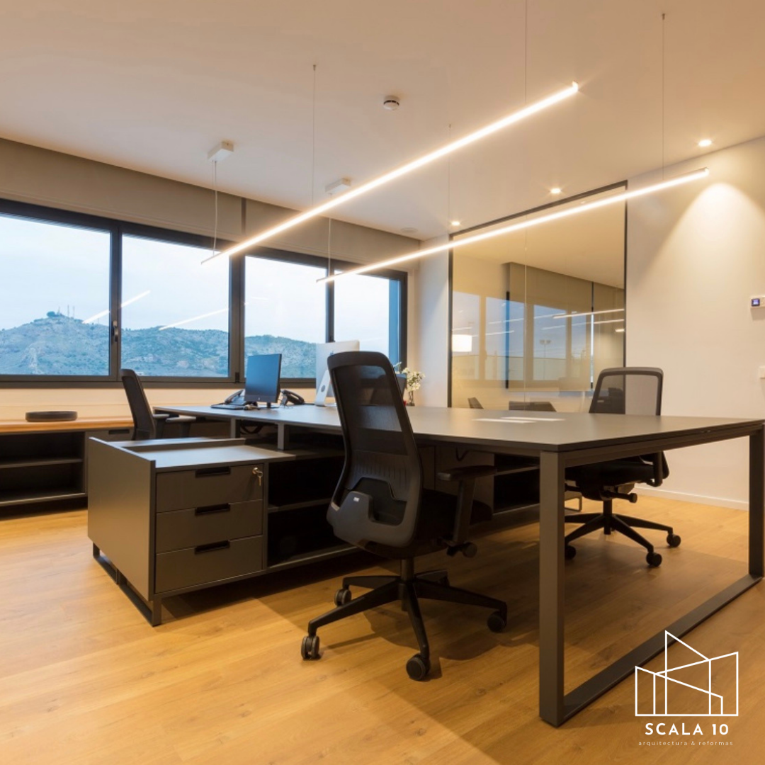 Vista de una oficina personalizada tras la reforma integral en Canillejas, Madrid, con separador de vidrio templado que reduce ruido sin afectar la amplitud del espacio. Se incorporó iluminación LED en tiras y ventanas negras que generan contraste, combinando funcionalidad, modernidad y elegancia en un entorno profesional.