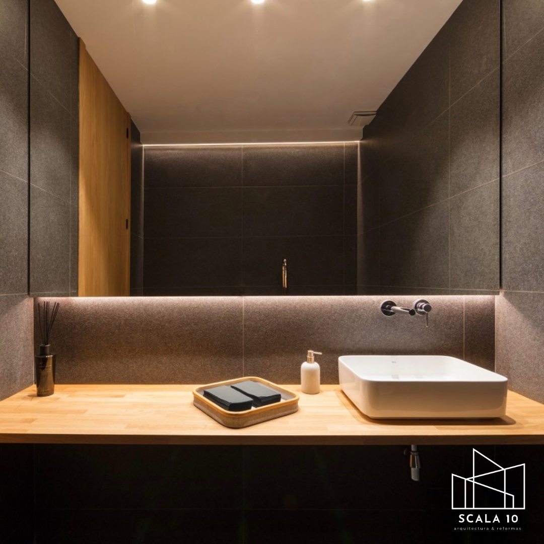 Baño de oficina con cerámica oscura y espejo LED en Canillejas