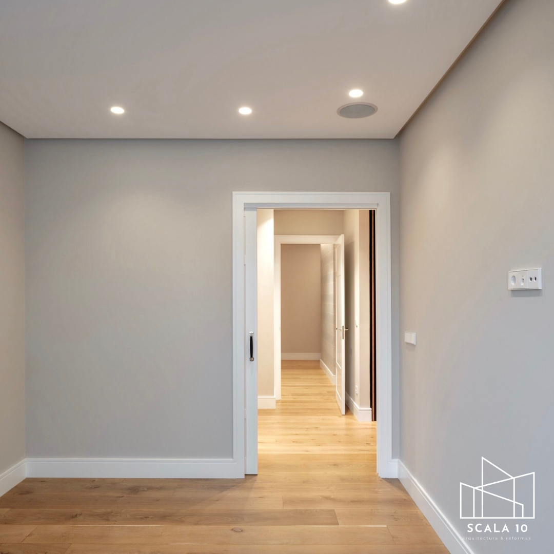 Vista de una habitación tras la reforma integral en Chamartín, Madrid, donde se aprecia el espacio optimizado u la iluminación proporcionada por un falso techo con focos LED pequeños pero potentes. Este diseño aporta un estilo minimalista, moderno y funcional, maximizando la amplitud y la confortabilidad del espacio.