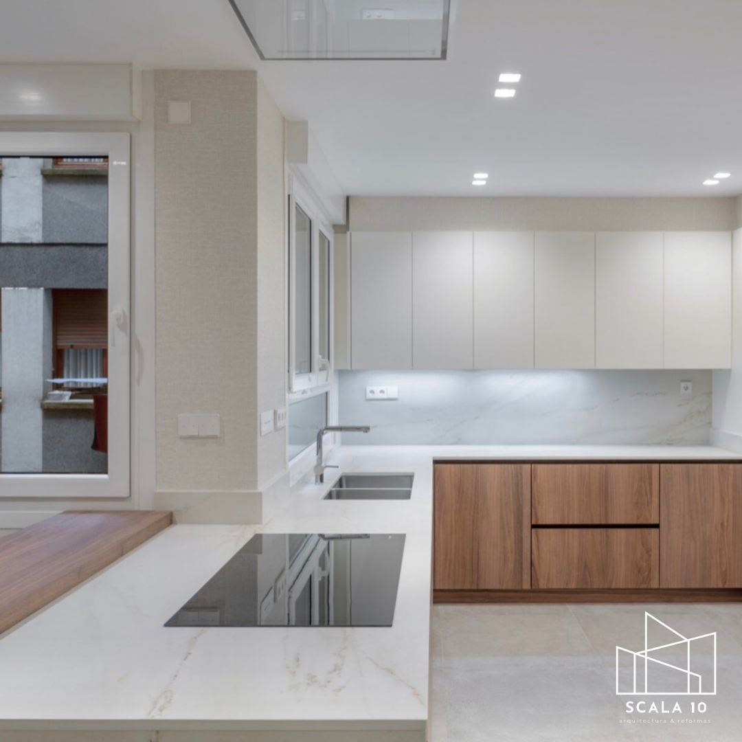 Vista de la cocina tras la reforma integral en Chamartín, Madrid, diseñada como cocina integrada para optimizar el espacio y mantener un estilo minimalista. Se incorporó iluminación LED bajo los módulos de almacenaje, suelo de cerámica para mayor funcionalidad y acabados en madera que aportan contraste, calidez y elegancia al conjunto.