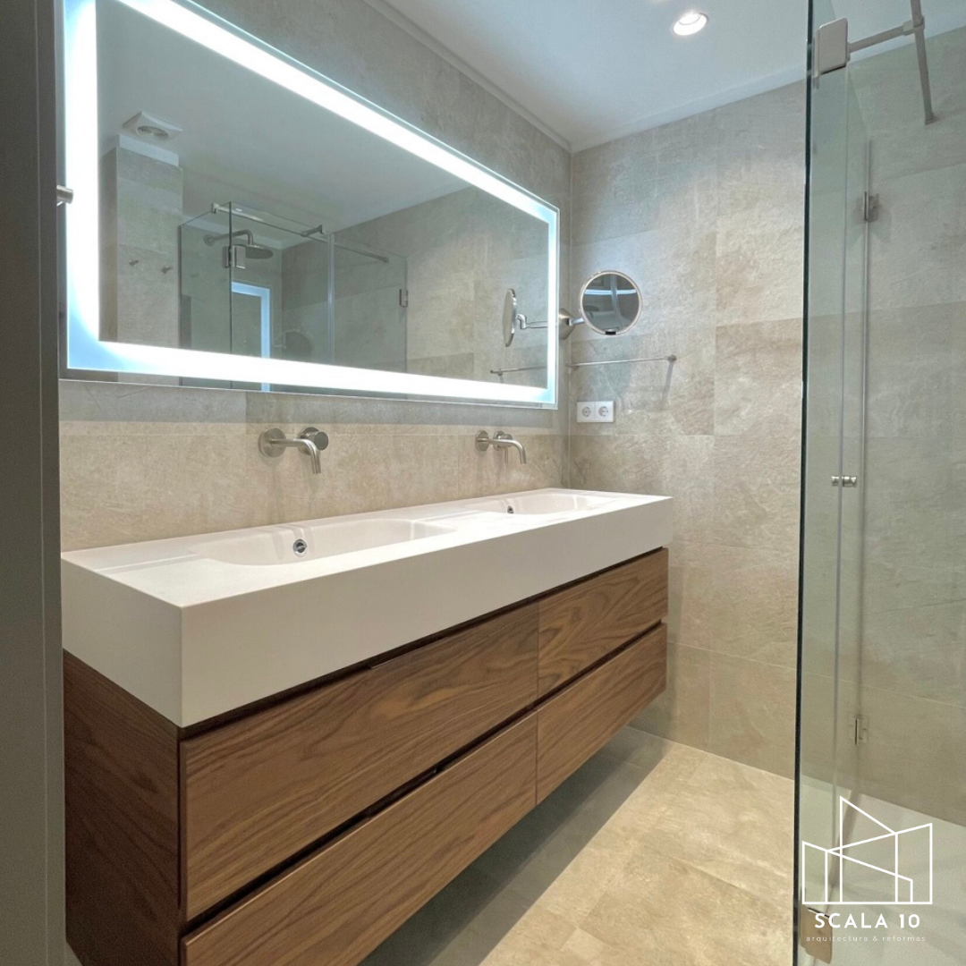 Baño reformado con espejo LED y lavamanos blancos en piso de Chamartín