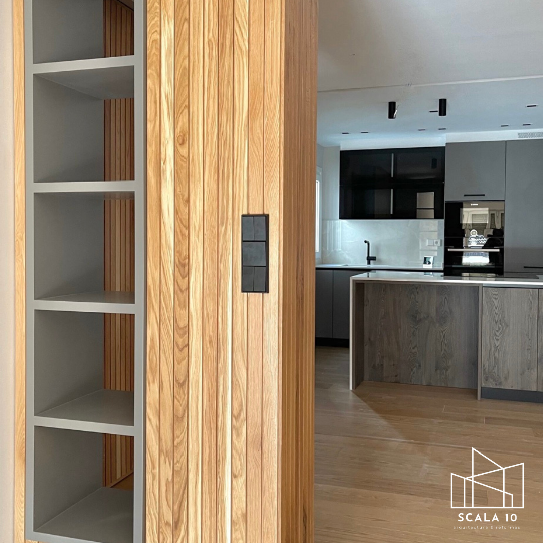 Detalle de pared falsa con madera y espacio de almacenaje en piso reformado de Chamartín