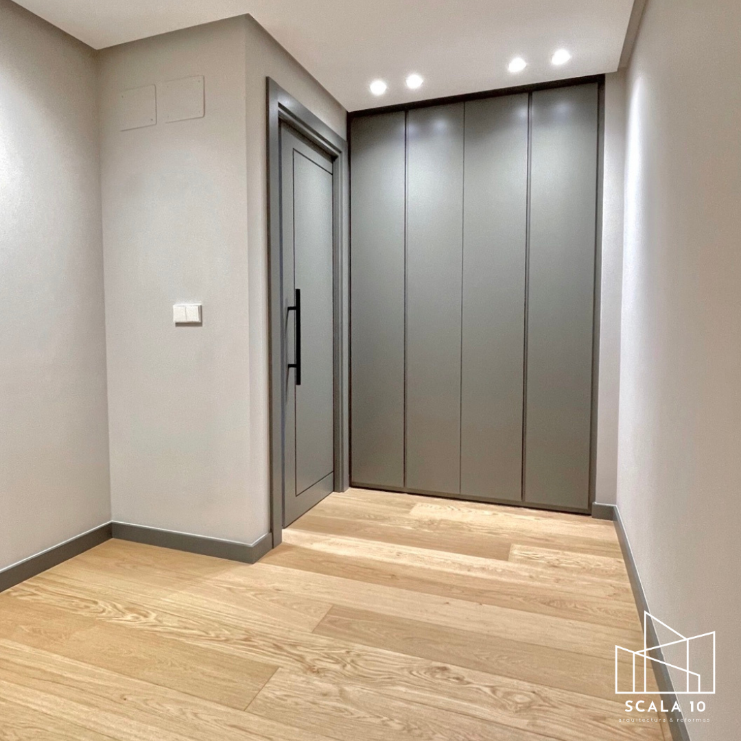 Detalle tras la reforma integral en Chamartín, Madrid, donde las paredes y puertas en gris mate armonizan con el diseño minimalista del piso. Se instaló falso techo con iluminación integrada, aportando luz uniforme, modernidad y un estilo elegante y sofisticado en todo el espacio.