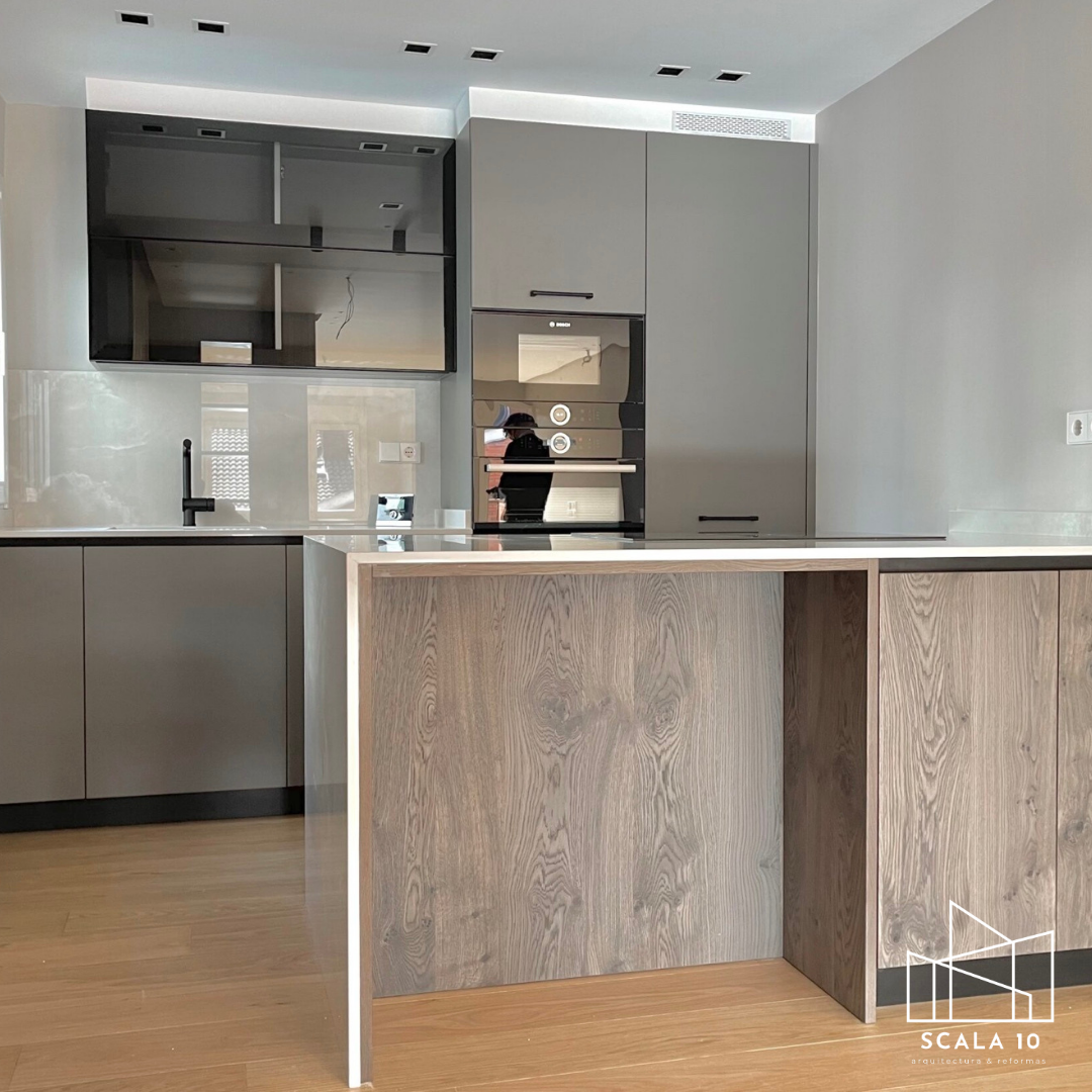 Vista de la cocina tras la reforma integral en Chamartín, Madrid, pequeña pero totalmente funcional. La separación con la sala y comedor se logra mediante la columna central, y los acabados elegantes y estratégicos permiten aprovechar al máximo el espacio, creando un ambiente moderno y armonioso.