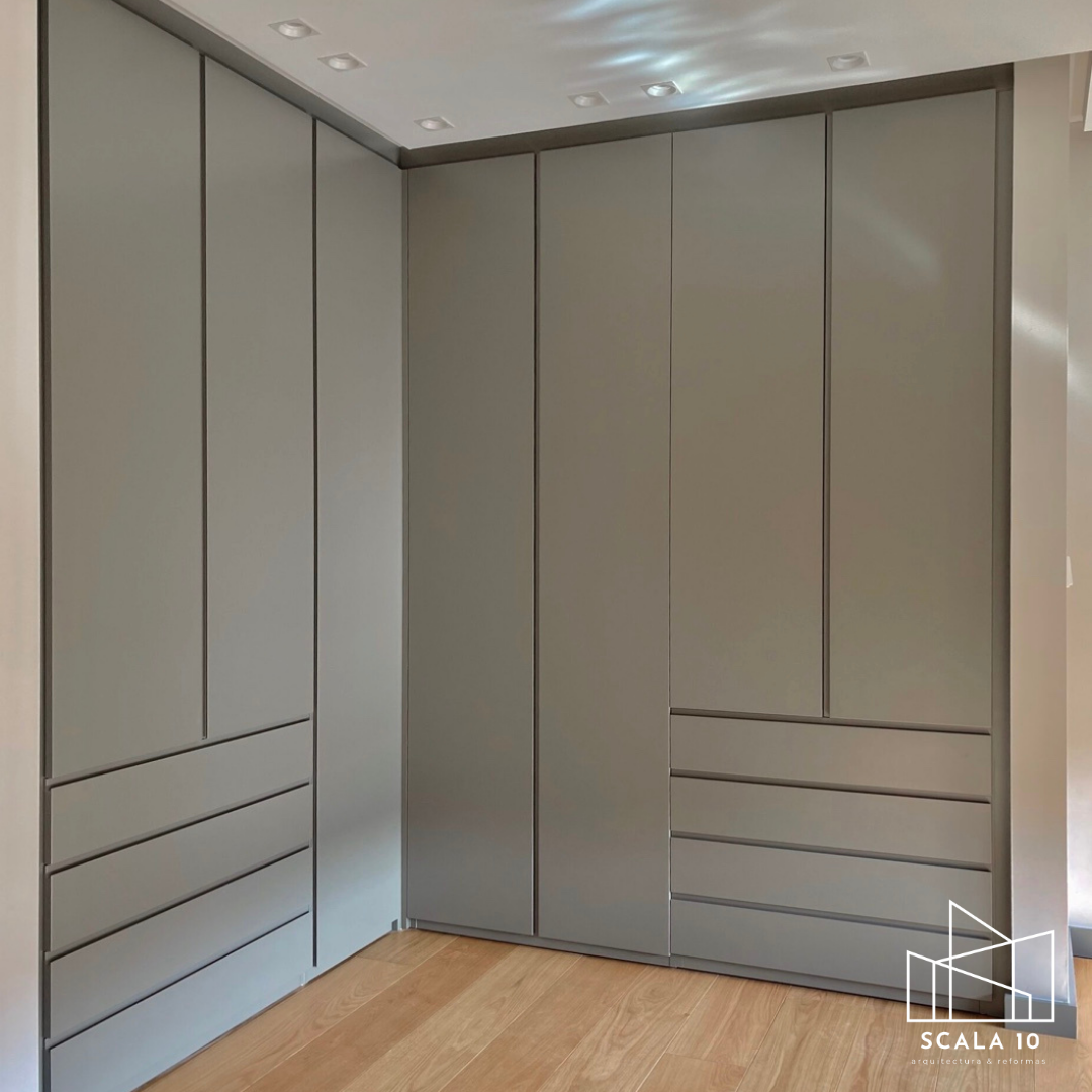 Detalle de los armarios integrados a las paredes tras la reforma integral en Chamartín, Madrid, optimizando el espacio de la habitación sin perder amplitud. Se aprecian los acabados de primera calidad y la tonalidad uniforme, creando un diseño moderno, funcional y elegante.