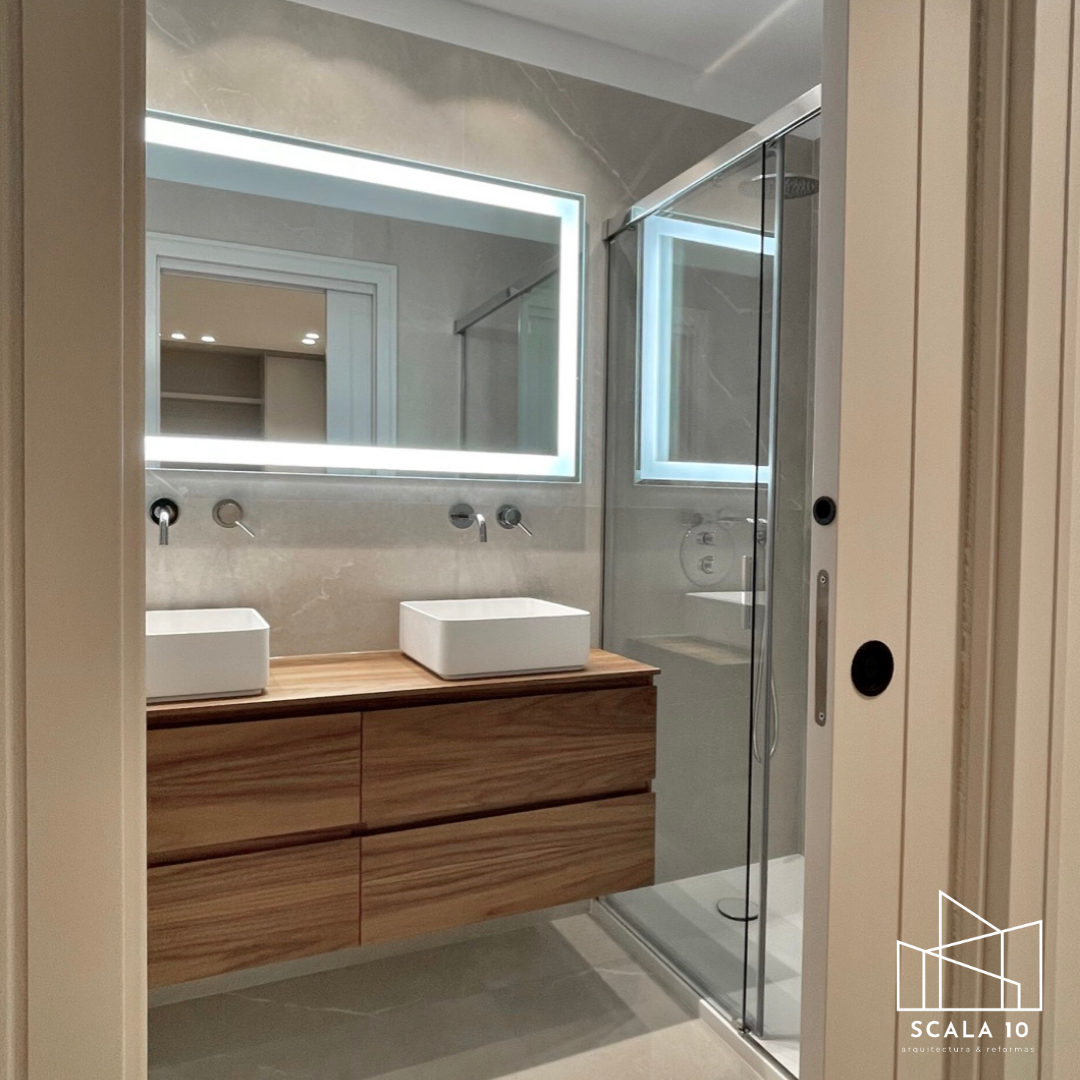 Vista del baño tras la reforma integral en Salamanca, Madrid, diseñado especialmente para parejas con doble lavamanos y espejo con iluminación LED integrada. La ducha con puerta de vidrio templado y los acabados en madera aportan elegancia y modernidad, creando un espacio funcional, minimalista y sofisticado acorde a las últimas tendencias.