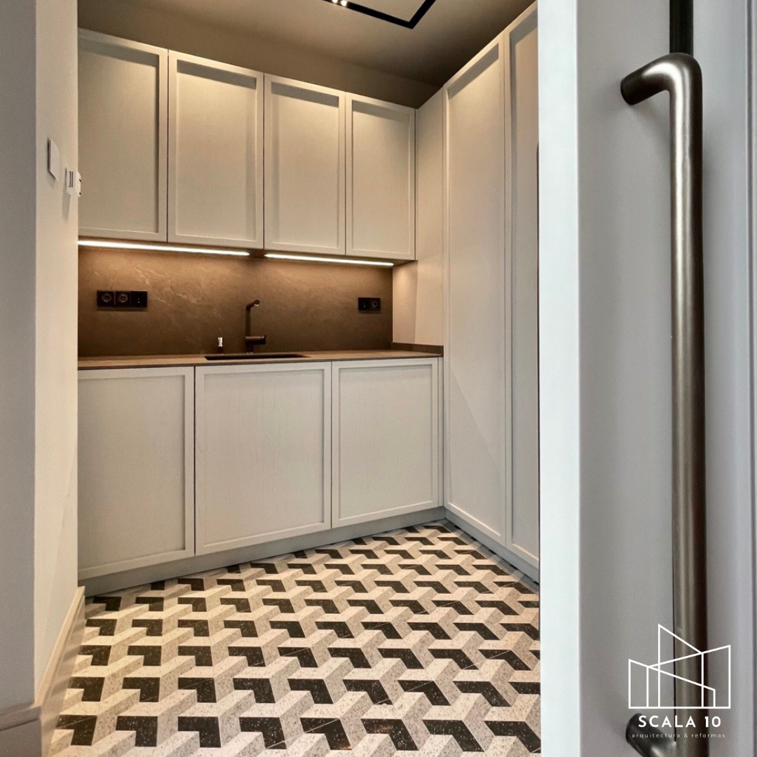 Cuarto de almacenaje tras la reforma integral en Chamartín, Madrid, donde se renovó el espacio con detalles en cubos que generan un efecto visual innovador. Incorpora compartimientos integrados, iluminación LED en tiras y cerámica en color negro, logrando un diseño moderno, funcional y elegante.
