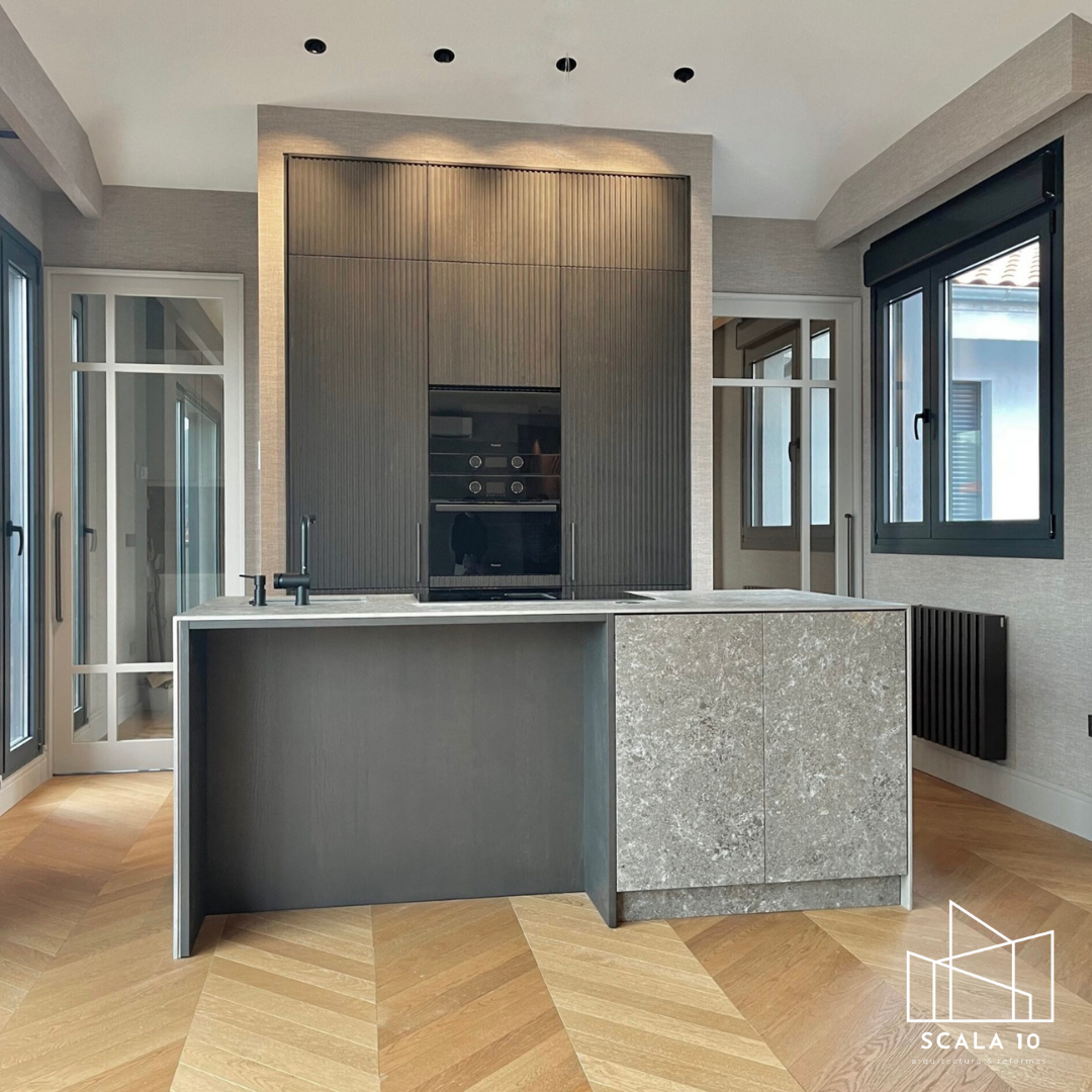 Cocina tras la reforma integral en Chamartín, Madrid, diseñada con acabados en tonos oscuros y una isla central que aportan elegancia y funcionalidad. La iluminación LED sobre la cocina mejora la visibilidad y refuerza el estilo moderno y sofisticado del espacio.